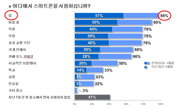 한편, 스마트폰을 사용하는 장소로 이동 중(90%)보다 집(98%)이 더 많은 것으로 조사돼 눈길을 끌었다.