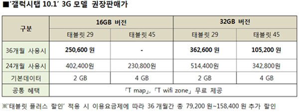 SK텔레콤 ‘갤럭시탭10.1’ 구매 고객은 데이터 사용패턴에 따라 월 2GB의 기본데이터를 제공하는 ‘태블릿29’(월 29,000원) 또는 월 4GB를 제공하는 ‘태블릿45’(월 45,000원) 요금제로 가입할 수 있다.