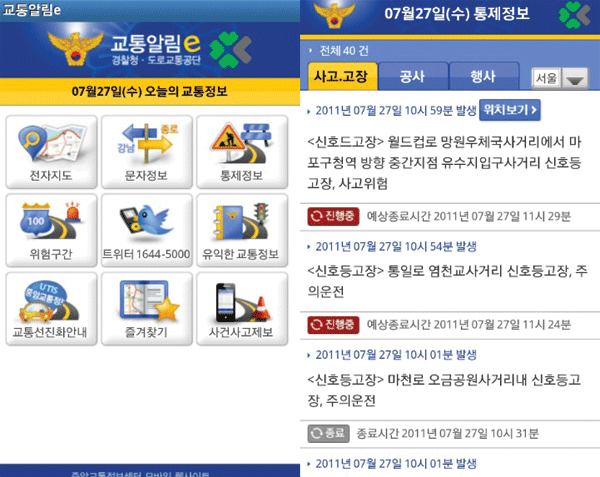 ▲전국기반 교통정보 ‘교통알림e’=집중 폭우로 인해 올림픽대로, 남부순환로, 강남대로 일대 등 서울의 많은 도로가 통제됐다. 실시간 교통정보를 듣지 못해 통제된 도로로 들어서 낭패를 보는 사람들이 속출했다.