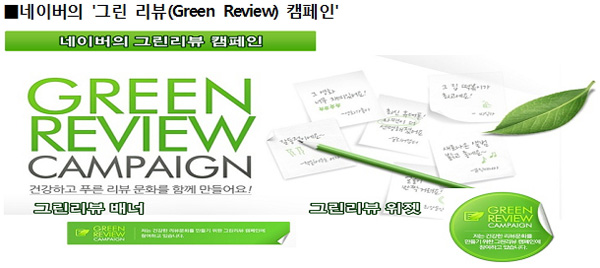 NHN은 푸른 리뷰 문화를 위한 블로거의 자율준수사항을 안내하는 ‘그린 리뷰 캠페인’을 추진해 그린 리뷰 배너, 위젯을 제공하고, 인센티브를 하반기 중 검토·제공하는 등 참여를 활성화할 계획이다.
