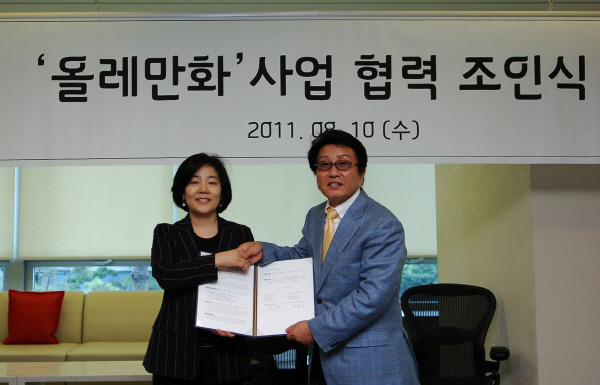 [포토]만화사업도 ‘올레!’ 김 종한 2011/08/10 2011/08/10 [포토]만화사업도 ‘올레!’에 댓글 닫힘 KT와 대원미디어는 디지털 만화산업 활성화를 위해 만화 통합 플랫폼인? ‘올레만화’를 공동구축하기로 했다. 이를 위해 10일 서초동 올레캠퍼스에서 KT 콘텐츠&미디어사업본부장 송영희 전무(왼쪽)과 대원미디어 안현동 사장(오른쪽)이 ‘올레만화’사업 협정 조인식을 맺고 서로 악수하고 있다. (Visited 28 times, 1 visits today) 관련기사