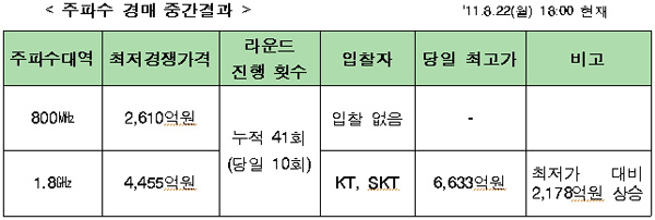 경매 나흘째, 1.8GHz 입찰가 ‘6633억’ yjpak 2011/08/22 2011/08/22 경매 나흘째, 1.8GHz 입찰가 ‘6633억’에 댓글 닫힘 1.8GHz 주파수 대역 경매 나흘째, 최고 입찰가가 6633억원으로 치솟았다. 방송통신위원회는 22일 800㎒?1.8㎓대역 이동통신용 주파수 경매를 진행한 결과, KT와 SK텔레콤이 입찰을 나흘째 지속한 1.8㎓ 대역은 10라운드(누적 41라운드)가 진행돼 현재까지 최고입찰가는 6633억원이라고 밝혔다. 주파수 경매는 23일 09시에 다시 속개될 예정이다. 출처: 방송통신위원회 (Visited 52 times, 1 visits today) 관련기사