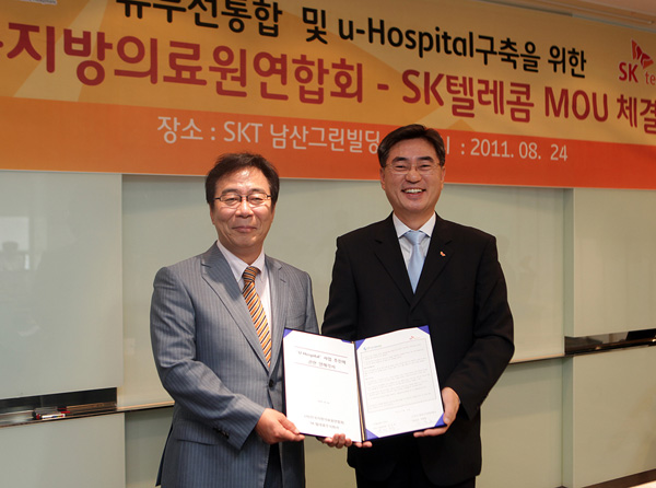 SK텔레콤 박민혁 본부장(사진 오른쪽)과 전국지방의료원연합회 정종훈 회장이 24일 중구 남산그린빌딩에서 ICT를 활용한 의료서비스 향상을 위해 ‘유무선 통합 및 u-Hospital구축 협약’을 맺고 기념사진을 촬영하고 있다.