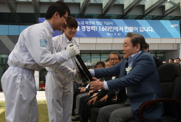22일 삼성전자 반도체 나노시티 화성캠퍼스에서 개최된 '메모리 16라인 가동식 및 20나노 D램·플래시 양산' 행사에서 이건희 회장이 임직원 대표들로부터 16라인에서 생산된 '1호 반도체 웨이퍼'를 전달받고 있다.