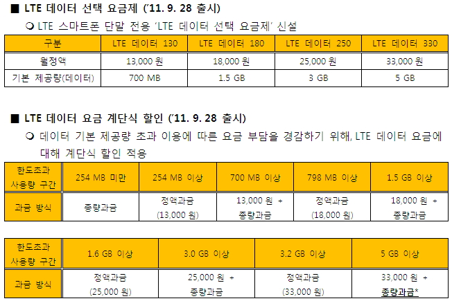 한편, SK텔레콤은 요금제 발표와 함께 이날부터 국내 최초로 LTE 스마트폰 ‘갤럭시 S Ⅱ LTE’ 판매에 들어간다. 이어 이달 내 HTC LTE폰 ‘레이더 4G’도 내놓을 예정이다.
