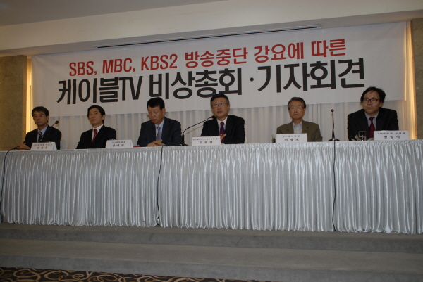 케이블TV업계는 14일 서울 코리아나호텔에서 비상총회를 열고 지상파 재전송 문제 해결을 위해 방송통신위원회 협의체가 운영되는 가운데 협상이 결렬되면 지상파 방송을 전면 중단할 수 밖에 없다는 입장을 밝혔다.