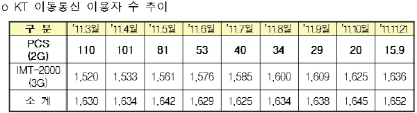 아울러 KT는 서비스 종료에 따른 불편을 겪지 않도록 3G 전환 지원프로그램 연장 운영, 3G 임대폰 무료 제공(7일간), 2G 번호 보관 서비스(6개월간) 등 다양한 이용자 보호방안을 운영키로 했다.