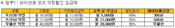 ‘와이브로 프리 약정할인’요금제는 기존 제공중인 와이브로 요금제(프리30, 프리50, 무제한)를 2년간 요금 약정 조건으로 각각 50~69% 할인한 것이다. ‘프리30 약정’, ‘프리50 약정’, ‘무제한 약정‘ 등 총 3가지로 구성되며, 내년 6월말까지 가입이 가능하다.