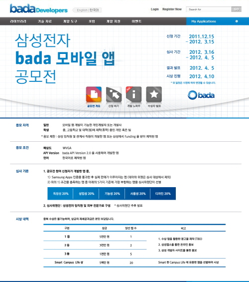 이번 공모전에는 모바일 앱 개발을 할 수 있는 개인 또는 단체라면 누구나 응모할 수 있으며, 바다 2.0 플랫폼을 기반으로 한 앱을 개발하면 된다. 참가 희망자는 바다 개발자 사이트의 해당 페이지(developer.bada.com/challenge/korea2012)를 통해 신청하면 된다.