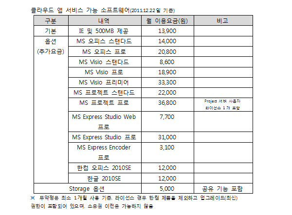 ‘클라우드 앱’을 이용하는 기업은 필요한 소프트웨어와 스토리지 용량을 선택해 이용할 수 있다. 현재 Ms-Office, 아래아 한글 등 14개 범용 소프트웨어가 제공되며 내년 1분기까지 30종류로 확대할 계획이다.