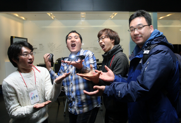 '시각장애인을 위한 공간인식기구'를 제안한 임직원들(왼쪽부터 삼성전자 임직원 김종복, 정성호, 조영상, 김종복)이 아이디어를 선보이고 있다.