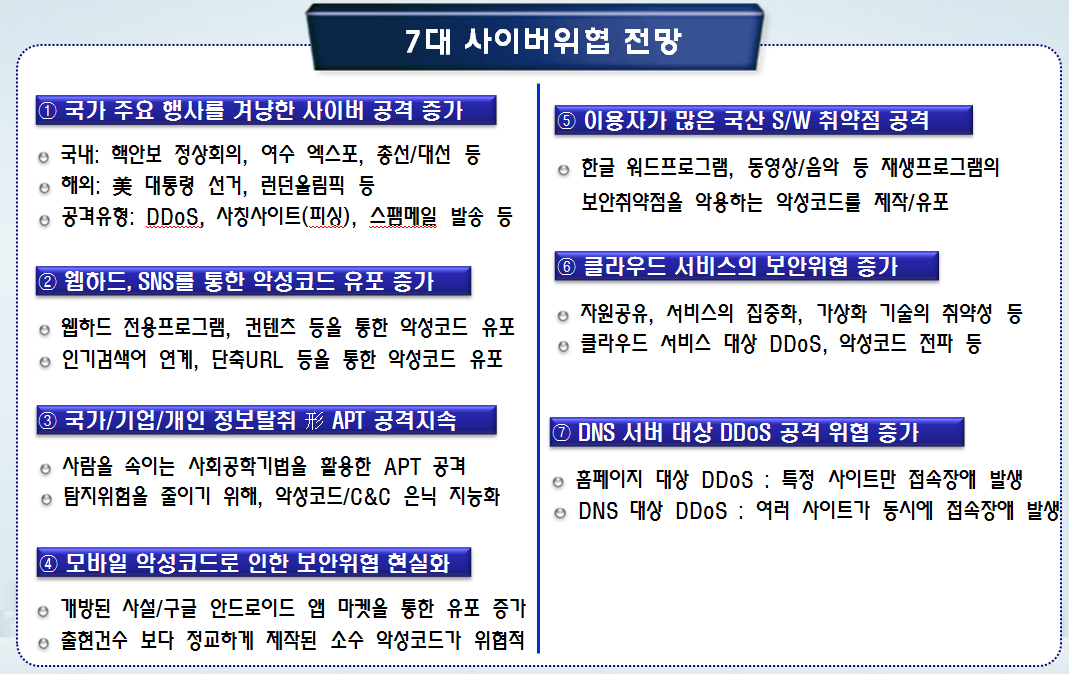 2012년 주요 사이버 위협으로는 국가적 주요행사를 겨냥한 사이버 공격 증가, 웹하드, SNS를 통한 악성코드 유포의 증가, 국가 및 주요기업 정보탈취 목적의 APT 공격 지속, 모바일 악성코드로 인한 보안위협 현실화, 이용자가 많은 국산 S/W 취약점 공격 증가, 클라우드 서비스의 보안위협 증가, DNS 서버 대상 DDoS 공격 증가 등이 예상된다고 밝혔다.