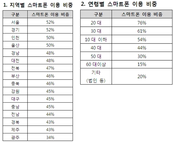 KT가 전체 휴대폰 고객을 대상으로 스마트폰 이용 비중을 조사한 결과, 1월말 기준 전국에서 스마트폰 비중이 가장 높은 곳은 서울과 경기도(52%)로 확인됐고 그 다음으로 인천과 울산(50%)이 뒤를 이었다. 스마트폰 비중이 전국에서 가장 낮은 곳은 광주(34%)였고 그 외 모든 지역이 40% 이상 스마트폰을 쓰는 것으로 나타났다.