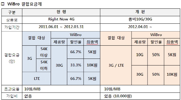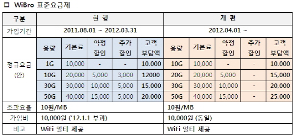 회사측에 따르면 특히, 와이브로 고객들의 월 평균 데이터 사용량이 6GB 수준임을 감안해 기존 가장 적은 용량인 1G 요금제를 10G로 10배 늘리고, 기존 10G 요금제를 20G로 2배 늘렸다. 기존 1G와 10G 요금제 이용 고객들은 별도 절차 없이 추가된 데이터량을 사용할 수 있다.