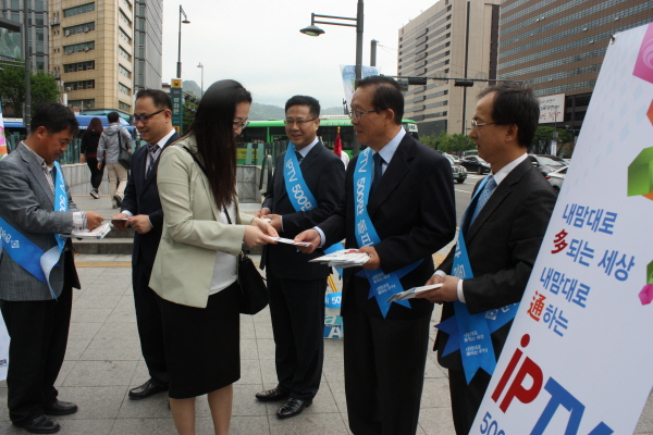 한국디지털미디어산업협회(회장 김원호, KODIMA)는 IPTV 실시간 가입자 500만 돌파를 즈음해 3일, 서울 도심 광화문(사진), 서울역 등 유동인구가 많은 지역에서 IPTV서비스와 가입방법 등을 알리는 가두 캠페인을 실시했다. KODIMA는 오는 8일에도 2차 가두 홍보에 나설 계획이다.