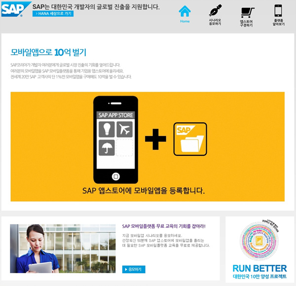 형 사장은 “모바일 앱을 SAP 앱스토어에 등록하면 전세계 20만 SAP 고객기업에 노출되며 SAP 고객사 가운데 0.1%만 모바일 앱을 구매해도 수십억 원의 수익을 올릴 수 있다. 국내 SW 개발자들이 SAP 앱스토어를 통해 세계 기업용 앱 시장을 선점해야 한다”고 강조했다.