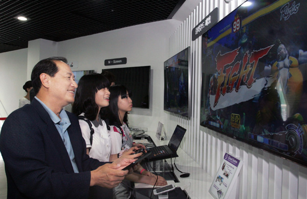 LG유플러스 부스에서 현장을 찾은 관람객과 함께 LTE 네트워크를 이용한 클라우드 게임을 시연하고 있는 모습