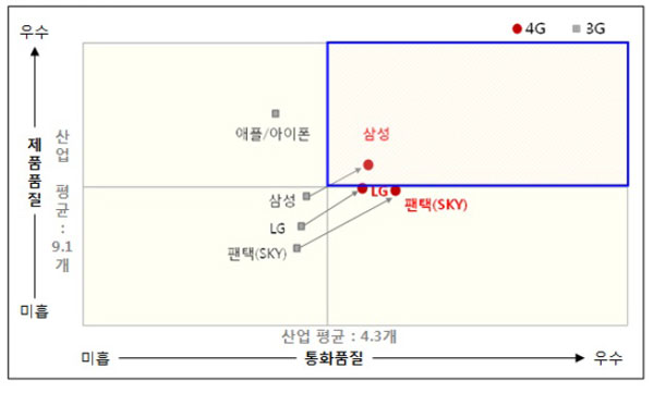 4G(LTE)로 옮겨가면서 국내 스마트폰 제조3사 모두 통화품질과 제품품질 모두에서 괄목할 만한 성장이 있었다. 삼성은 ‘통화품질’, ‘제품품질’ 모두에서 평균 이하 영역에 속했다가 산업 평균 이상으로 옮겨갔다. 4G로 가면서 승자는 팬택(SKY)이다. 통화품질에서는 팬택의 개선폭이 커 최하위에서 1위로 올라서는 쾌거를 이루었다.