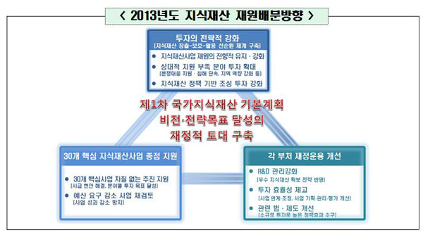 대통령 소속 ‘국가지식재산위원회'(공동위원장 국무총리ㆍ민간위원장 윤종용)는 27일 김황식 총리 주재로 제5차 회의를 개최하고, ‘2013년도 지식재산 재원배분방향’을 심의·의결해 국가지식재산전략추진에 필요한 재원을 원활히 확보하고 지식재산사업을 효율적으로 운용하기 위한 방안을 제시했다.