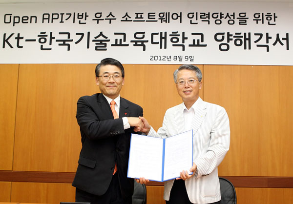 KT(회장 이석채)와 한국기술교육대학교(총장 전운기)는 천안에 있는 한국기술교육대학교 본원에서 우수 소프트웨어(SW) 인력 양성을 위한 전문 교육 프로그램 개발과 실습과정 개설을 위한 MOU를 체결했다고 9일 밝혔다.
