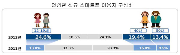 스마트폰 이용자의 19.3%가 스마트폰을 이용한지 6개월 미만인 ‘신규 스마트폰 이용자’이며 이 중 여성 신규 이용자가 52.8%로 남성보다 많았다. 연령별로는 12-19세가 4차 조사 (2012.1월 발표) 대비 11.6%p 증가한 24.6%로 가장 큰 비중을 차지하고 있었으며, 40, 50대의 신규 이용자 비중도 4차 조사 대비 각각 3.4%p와 3.9%p 증가한 19.4%와 13.4%인 것으로 나타나, 전 연령층에 걸쳐 스마트폰 이용이 대중화 되고 있는 것으로 분석됐다.