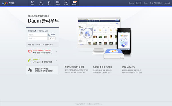 다음은 4일, 최대 20GB까지 무료로 문서나 사진을 저장?관리할 수 있는 개인 저장공간 ‘다음 클라우드(http://cloud.daum.net)’ 베타 서비스를 제공한다고 밝혔다.