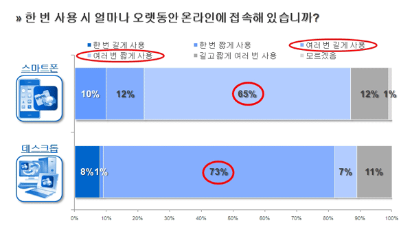 인터넷 사용 시간에 있어, 스마트폰은 여러 번 짧게 짧게 활용한다는 응답이 65%이었으며, 데스크톱에서 길게 여러 번 이용한다는 답이 73%로 가장 많아, 스마트폰 사용자들은 검색의 속도에도 보다 민감했다.