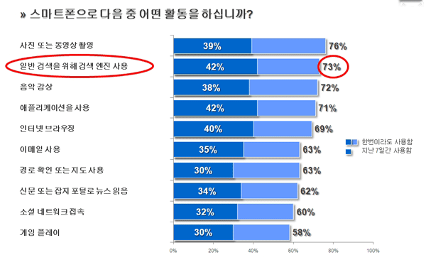 또한,? ‘지난 일주일간 스마트폰으로 무엇을 했는가’라는 질문에 73%(복수 응답 가능)가 검색을 위해 스마트폰을 활용했다고 답했으며, 검색 빈도를 묻는 질문에서는 하루에 여러 번이라고 답한 비율이 39%로 가장 높게 나타났다.